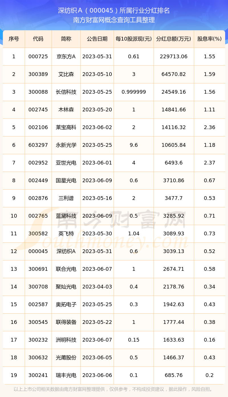 按照南方財富網(wǎng)趨勢選股系統(tǒng)統(tǒng)計,深紡織A所屬行業(yè)為偏光片行業(yè),偏光片行業(yè)分紅排名情況如下表: