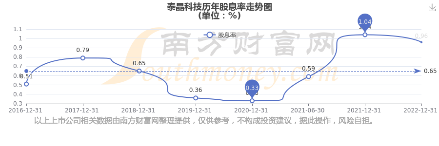 近年泰晶科技年度股息率走勢如下圖: