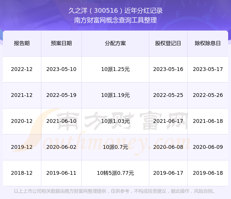 久之洋最新一次公布的分紅方案為10派1.25元。本次權(quán)益分派股權(quán)登記日為2023年5月16日,除權(quán)除息日為2023年5月17日,派息日為2023年5月17日。