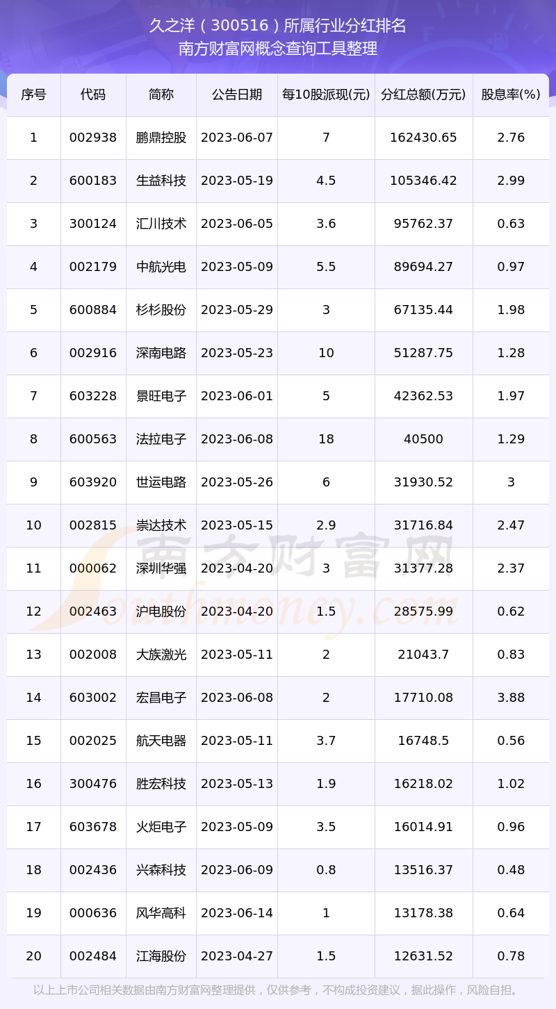 按照南方財(cái)富網(wǎng)趨勢(shì)選股系統(tǒng)統(tǒng)計(jì),久之洋所屬行業(yè)為電子元件行業(yè),電子元件行業(yè)分紅排名情況如下表: