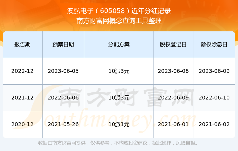 澳弘電子最新一次公布的分紅方案為10派3元。本次權(quán)益分派股權(quán)登記日為2023年6月8日,除權(quán)除息日為2023年6月9日,派息日為2023年6月9日。