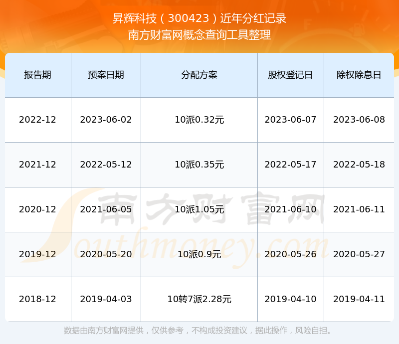 昇輝科技最新一次公布的分紅方案為10派0.32元。本次權(quán)益分派股權(quán)登記日為2023年6月7日,除權(quán)除息日為2023年6月8日,派息日為2023年6月8日。