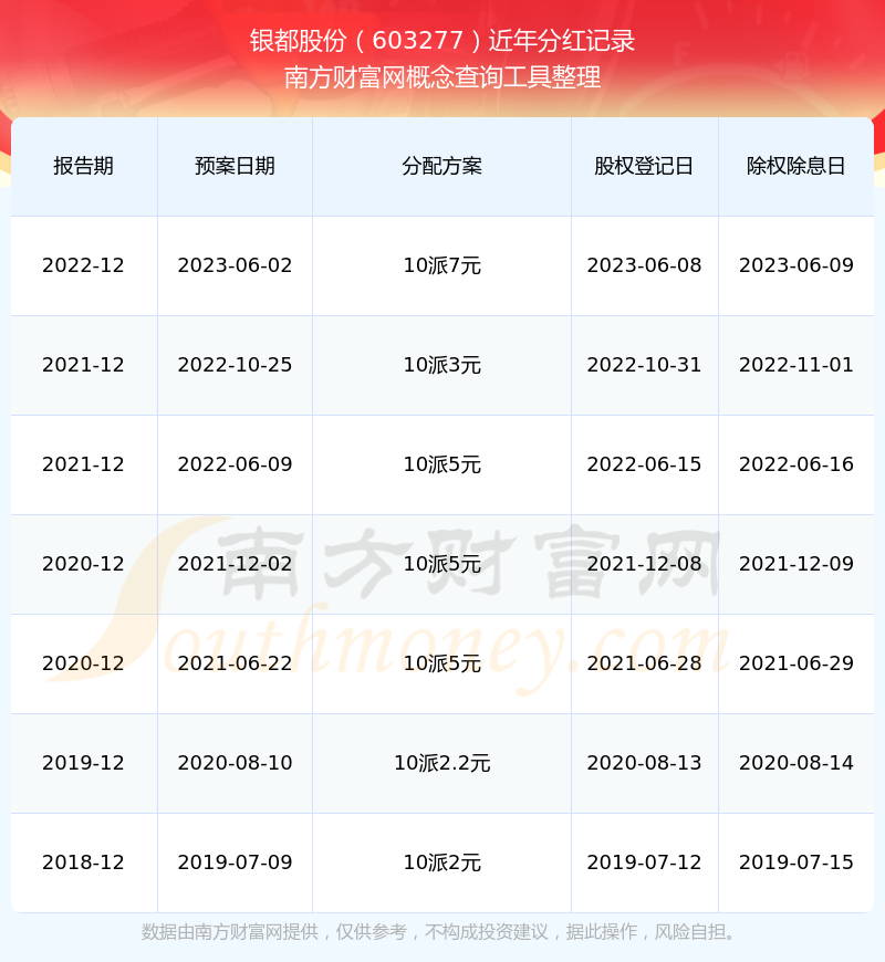 銀都股份最新一次公布的分紅方案為10派7元。本次權(quán)益分派股權(quán)登記日為2023年6月8日,除權(quán)除息日為2023年6月9日,派息日為2023年6月9日。