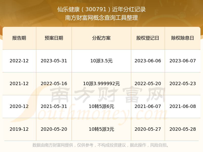 仙樂健康最新一次公布的分紅方案為10派3.5元。本次權(quán)益分派股權(quán)登記日為2023年6月6日,除權(quán)除息日為2023年6月7日,派息日為2023年6月7日。
