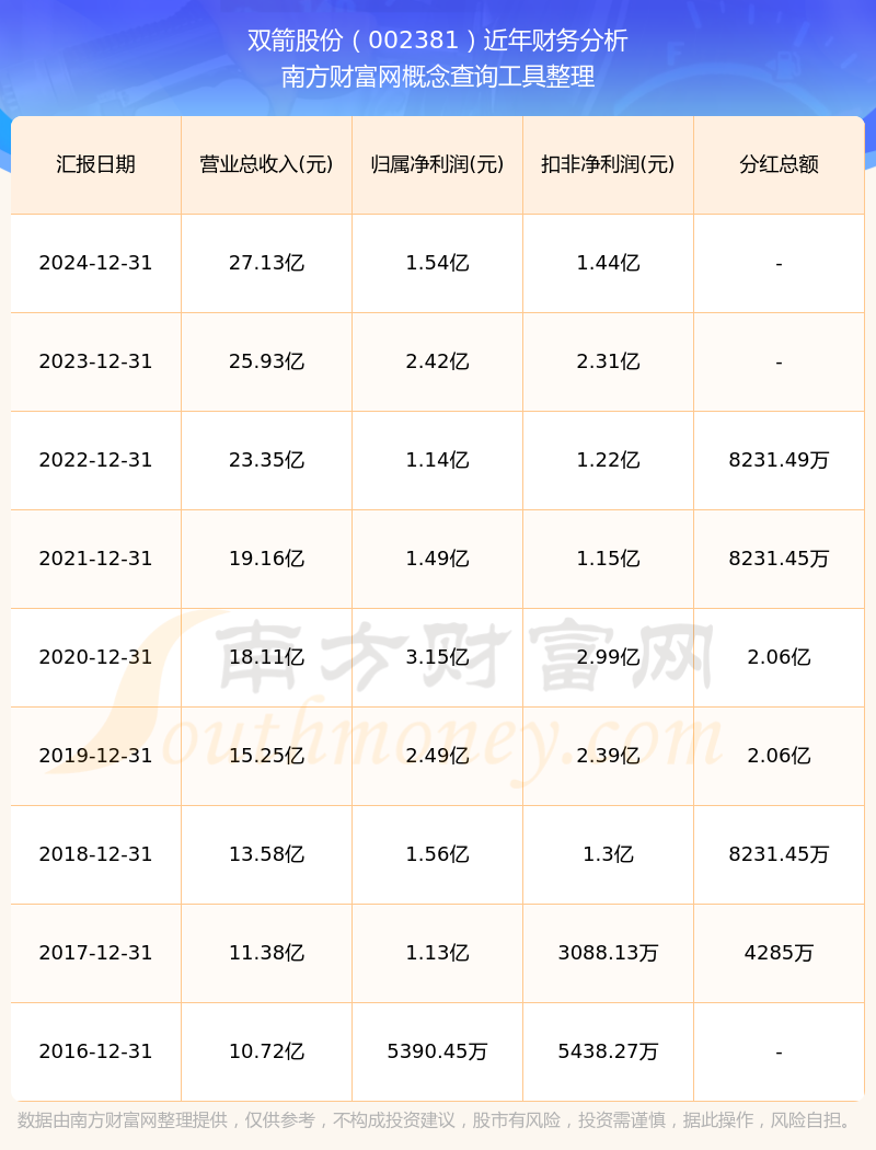 雙箭股份公司2024年實(shí)現(xiàn)營(yíng)業(yè)收入27.13億元,同比增長(zhǎng)4.64%;凈利潤(rùn)1.54億元,同比增長(zhǎng)-36.49%;毛利率17.63%。
