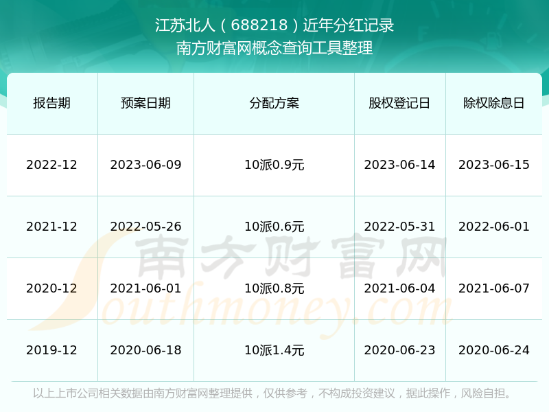 江蘇北人最新一次公布的分紅方案為10派0.9元。本次權益分派股權登記日為2023年6月14日,除權除息日為2023年6月15日,派息日為2023年6月15日。