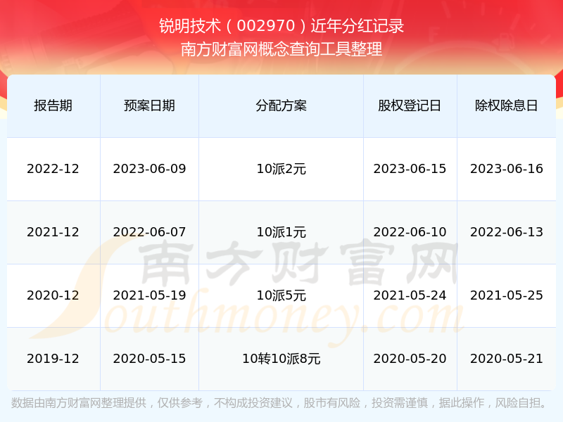 銳明技術(shù)最新一次公布的分紅方案為10派2元。本次權(quán)益分派股權(quán)登記日為2023年6月15日,除權(quán)除息日為2023年6月16日,派息日為2023年6月16日。