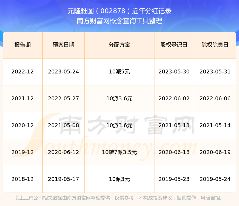 元隆雅圖最新一次公布的分紅方案:10派5元。
