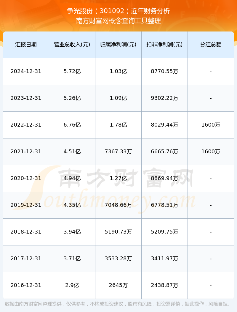 爭光股份2024年總營收5.72億,同比增長8.67%;凈利潤1.03億,同比增長-5.33%;銷售毛利率31.39%。
