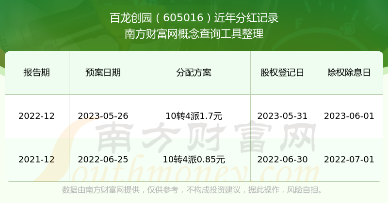 百龍創(chuàng)園最新一次公布的分紅方案為10轉(zhuǎn)4派1.7元。本次權(quán)益分派股權(quán)登記日為2023年5月31日,除權(quán)除息日為2023年6月1日,派息日為2023年6月1日。