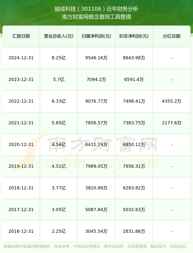 駿成科技公司2024年實現(xiàn)營業(yè)收入8.25億元,同比增長44.74%;凈利潤9546.16萬元,同比增長34.56%;毛利率22.57%。