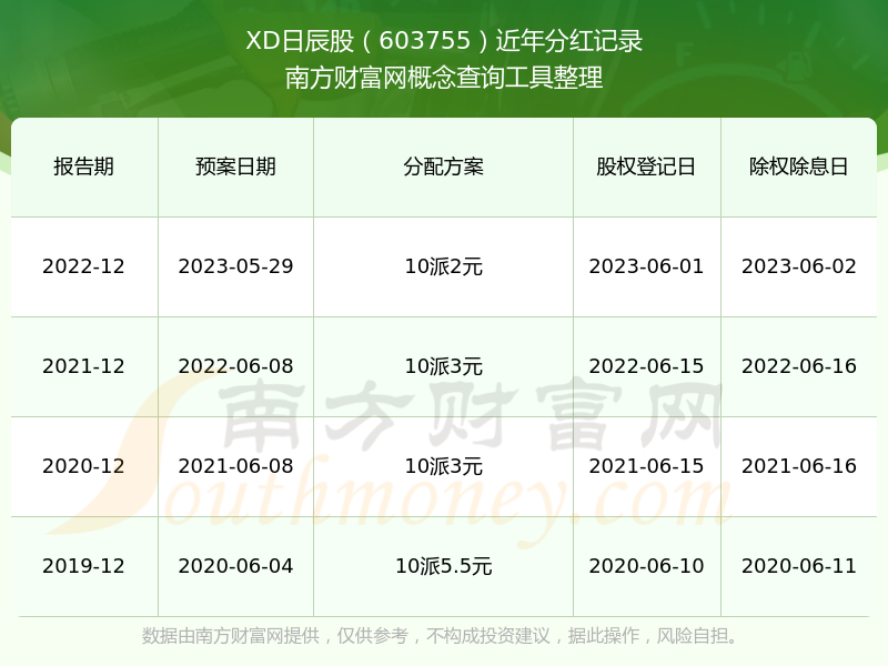 XD日辰股最新一次公布的分紅方案為10派2元。本次權(quán)益分派股權(quán)登記日為2023年6月1日,除權(quán)除息日為2023年6月2日,派息日為2023年6月2日。