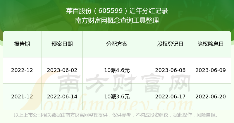 菜百股份最新一次公布的分紅方案為10派4.6元。本次權(quán)益分派股權(quán)登記日為2023年6月8日,除權(quán)除息日為2023年6月9日,派息日為2023年6月9日。