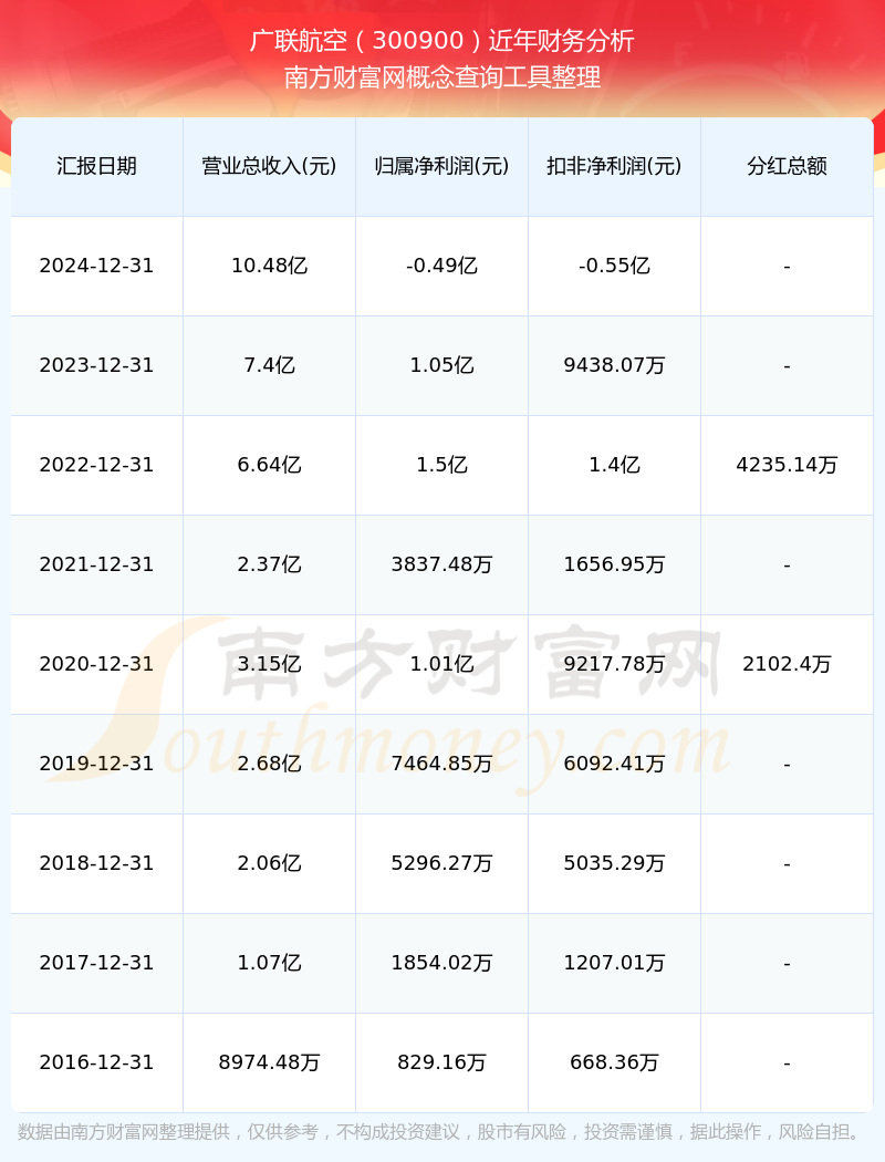 廣聯(lián)航空2024年總營收10.48億,同比增長41.64%;凈利潤-4909.78萬,同比增長-146.94%;銷售毛利率28.95%。