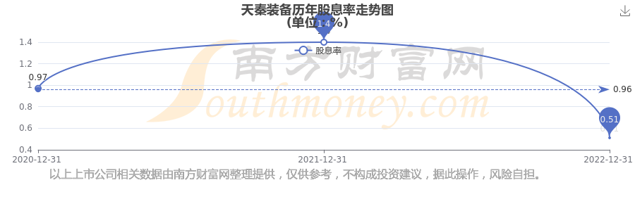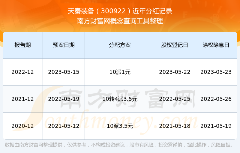 天秦裝備最新一次公布的分紅方案為10派1元。本次權益分派股權登記日為2023年5月22日,除權除息日為2023年5月23日,派息日為2023年5月23日。