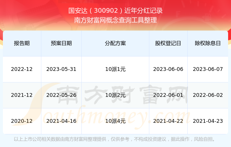 國(guó)安達(dá)最新一次公布的分紅方案為10派1元。本次權(quán)益分派股權(quán)登記日為2023年6月6日,除權(quán)除息日為2023年6月7日,派息日為2023年6月7日。