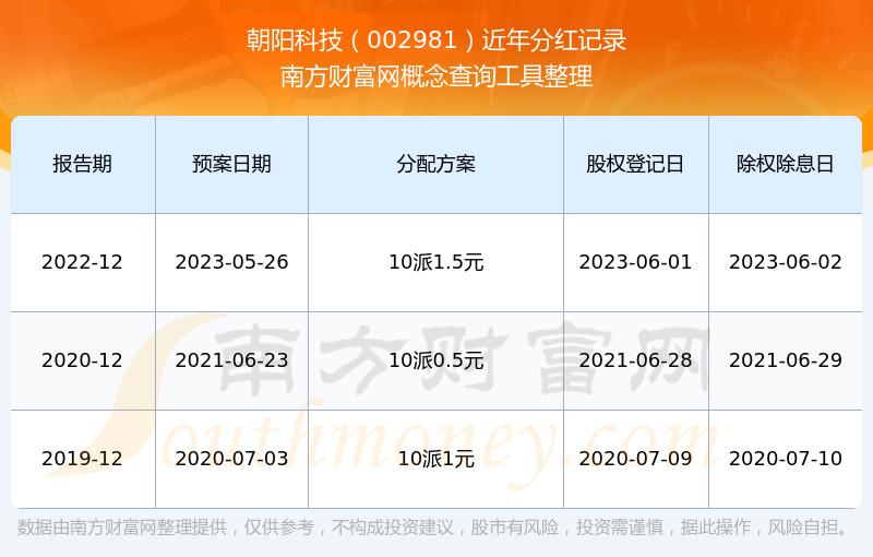 朝陽科技?xì)v年分紅派息情況如下表所示: