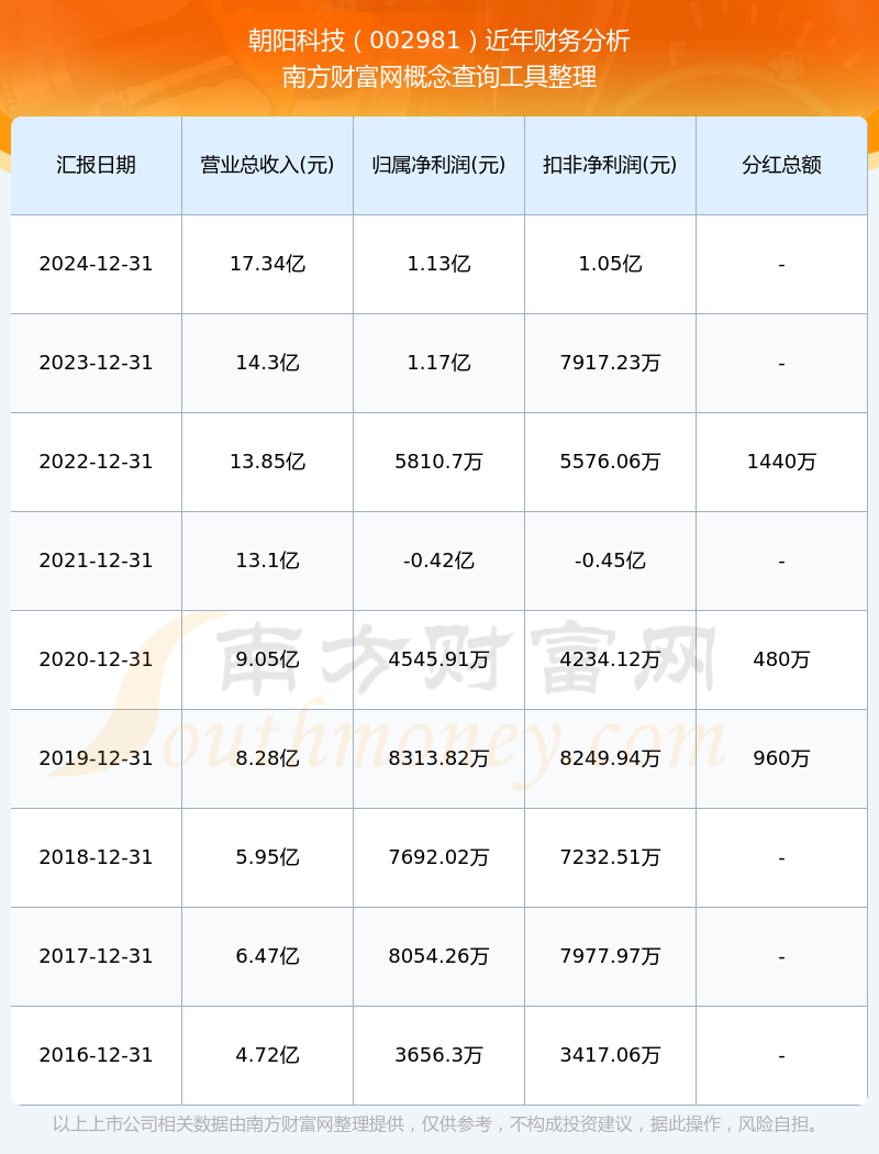 朝陽科技2024年總營收17.34億,同比增長21.24%;凈利潤1.13億,同比增長-3.31%;銷售毛利率21.91%。