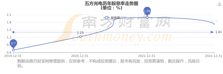 五方光電最新一次公布的分紅方案為10派2元。本次權(quán)益分派股權(quán)登記日為2023年5月22日,除權(quán)除息日為2023年5月23日,派息日為2023年5月23日。