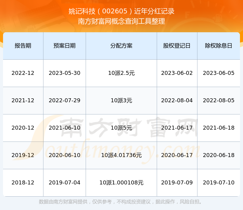 姚記科技最新一次公布的分紅方案為10派2.5元。本次權(quán)益分派股權(quán)登記日為2023年6月2日,除權(quán)除息日為2023年6月5日,派息日為2023年6月5日。
