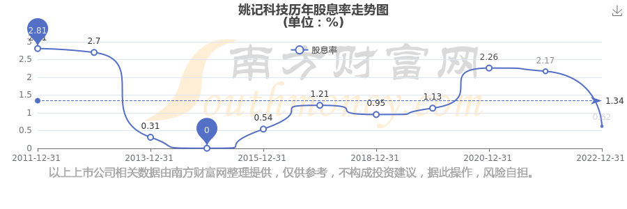 姚記科技?xì)v年股息率走勢(shì)如下圖: