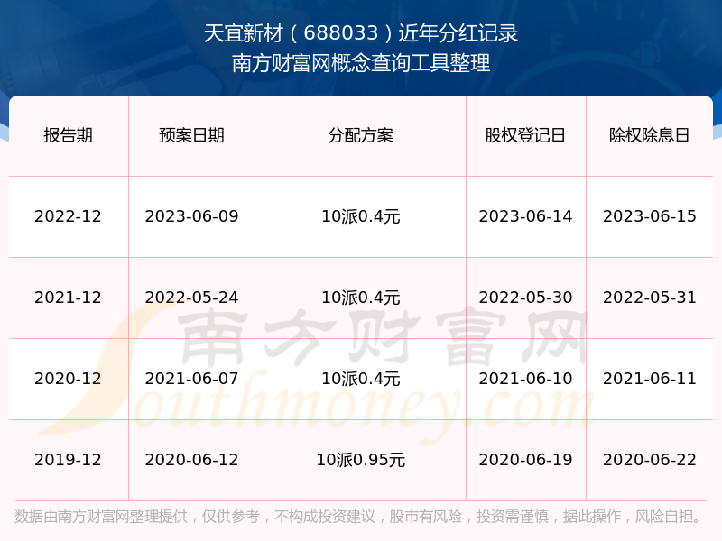 天宜新材最新一次公布的分紅方案為10派0.4元。本次權(quán)益分派股權(quán)登記日為2023年6月14日,除權(quán)除息日為2023年6月15日,派息日為2023年6月15日。