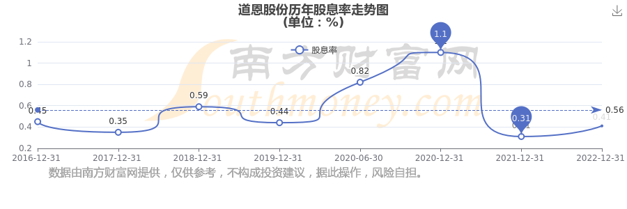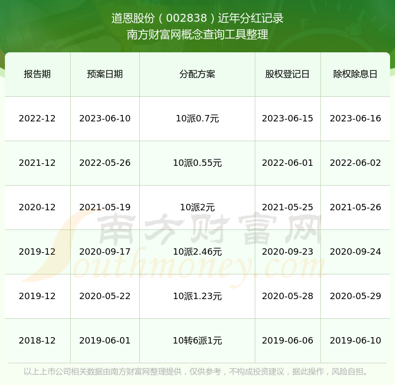 道恩股份最新一次公布的分紅方案為10派0.7元。本次權(quán)益分派股權(quán)登記日為2023年6月15日,除權(quán)除息日為2023年6月16日,派息日為2023年6月16日。