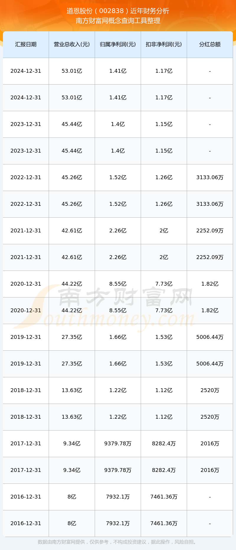 道恩股份公司2024年實(shí)現(xiàn)營業(yè)收入53.01億元,同比增長16.65%;凈利潤1.41億元,同比增長0.67%;毛利率11.84%。