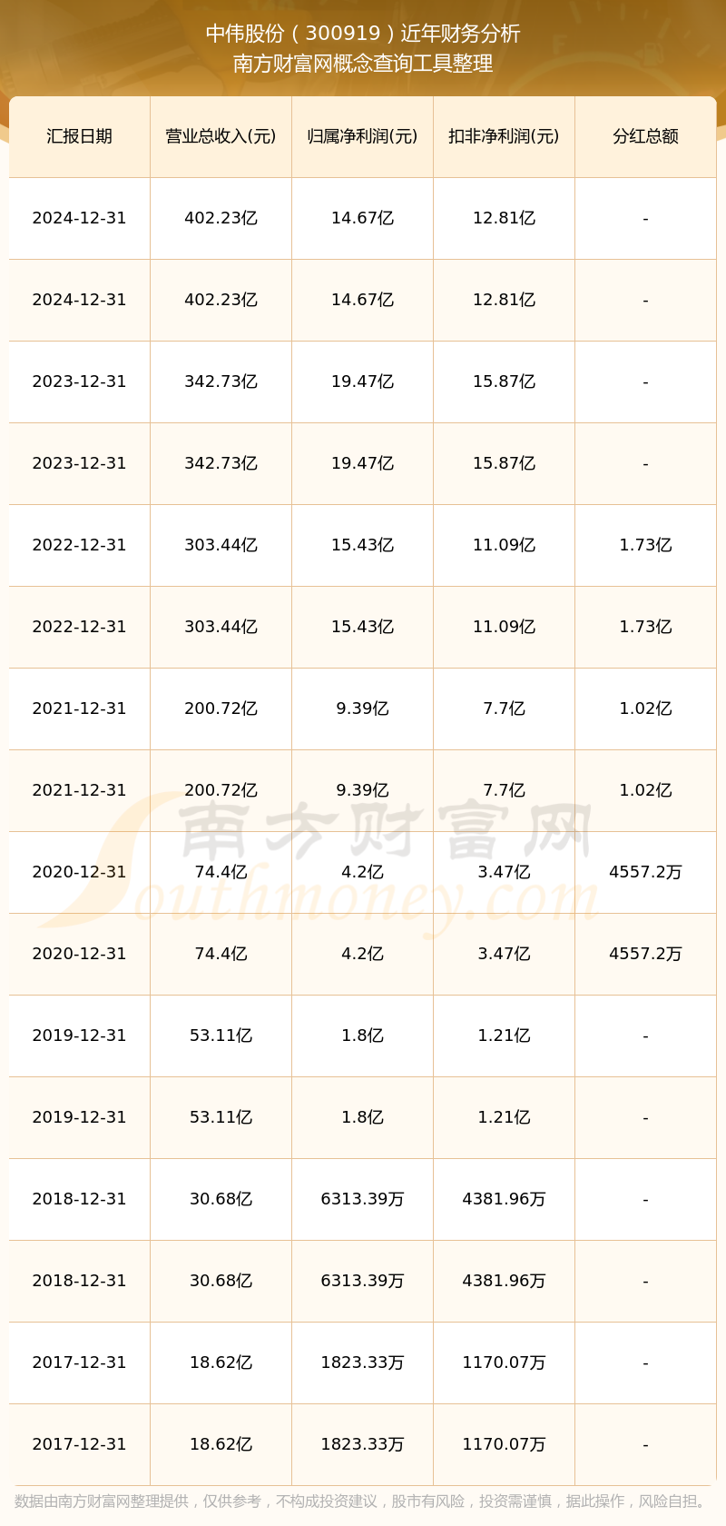 中偉股份公司2024年實(shí)現(xiàn)營收402.23億元,凈利潤14.67億元,毛利率12.12%。