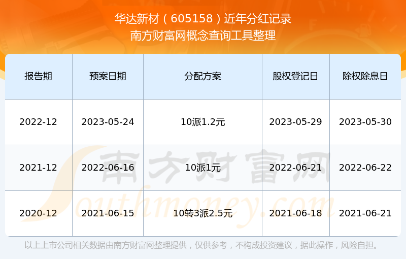 華達(dá)新材最新一次公布的分紅方案為10派1.2元。本次權(quán)益分派股權(quán)登記日為2023年5月29日,除權(quán)除息日為2023年5月30日,派息日為2023年5月30日。