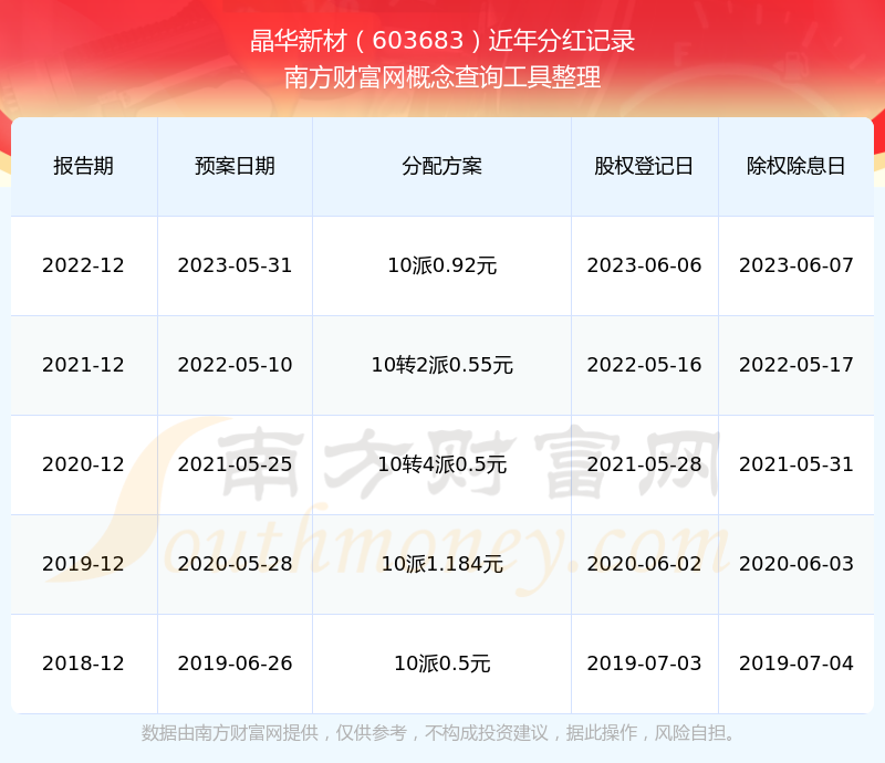 晶華新材最新一次公布的分紅方案為10派0.92元。本次權益分派股權登記日為2023年6月6日,除權除息日為2023年6月7日,派息日為2023年6月7日。