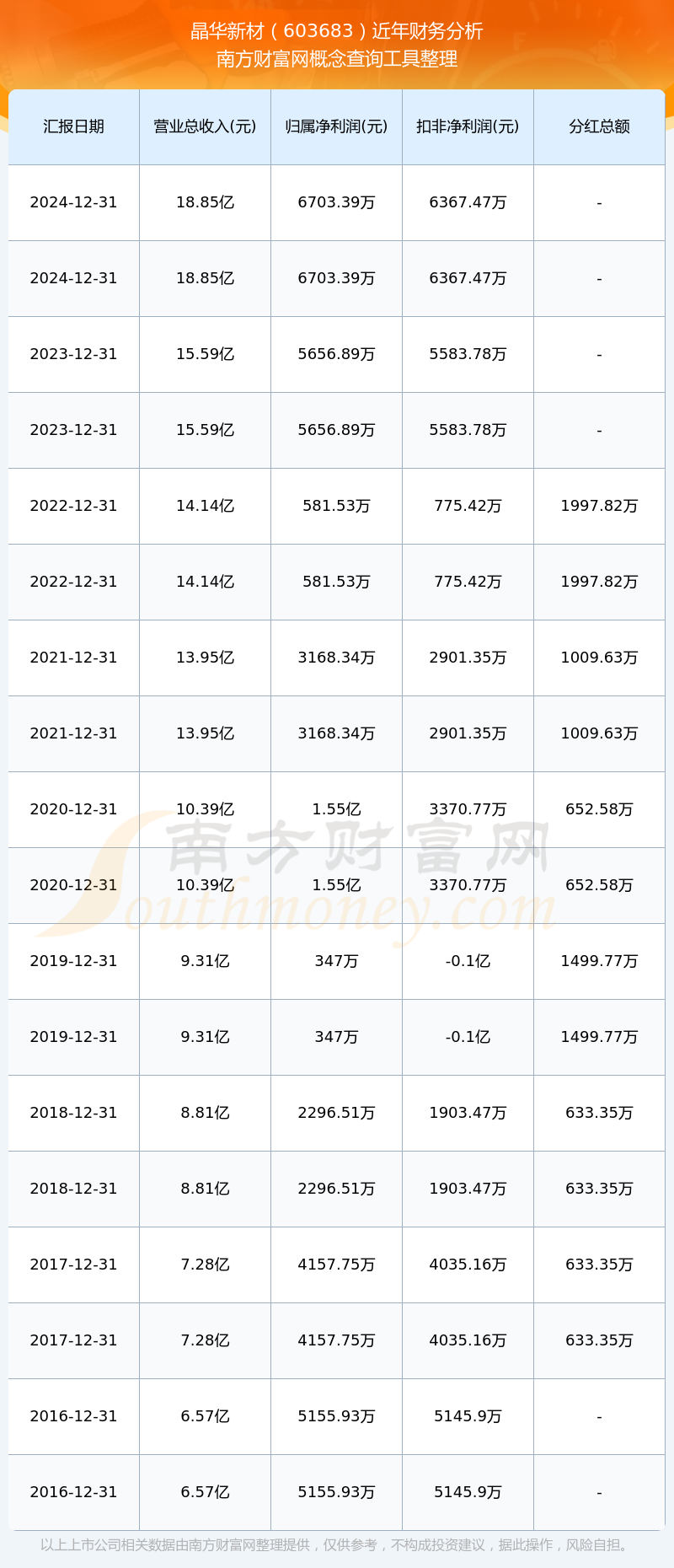 晶華新材公司2024年實現營業(yè)收入18.85億元,同比增長20.94%;凈利潤6703.39萬元,同比增長18.5%;毛利率17.09%。