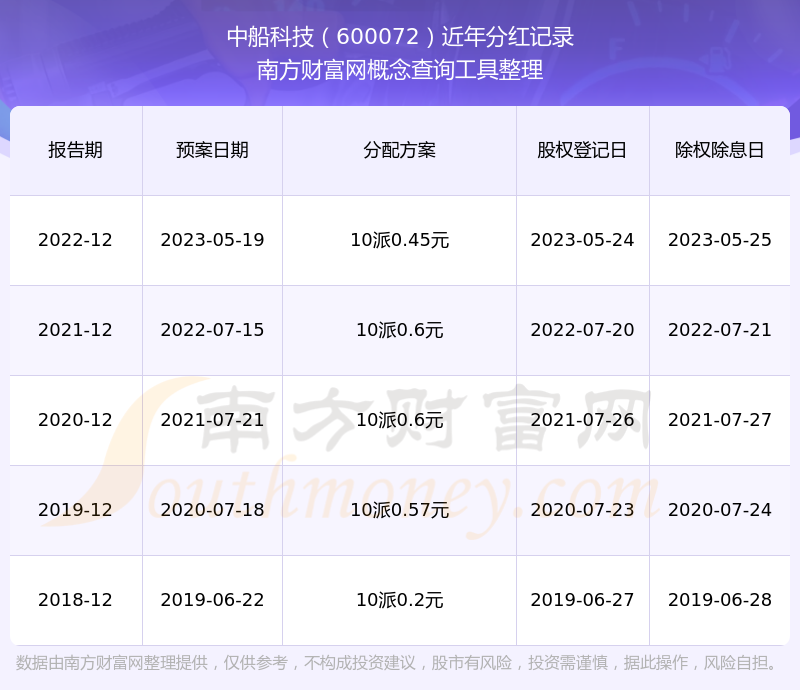 中船科技最新一次公布的分紅方案為10派0.45元。本次權(quán)益分派股權(quán)登記日為2023年5月24日,除權(quán)除息日為2023年5月25日,派息日為2023年5月25日。