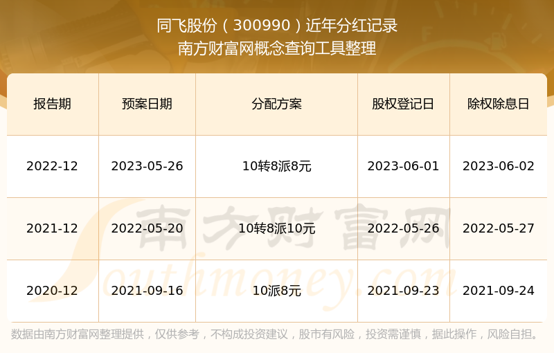 近年同飛股份分紅派息情況如下表所示: