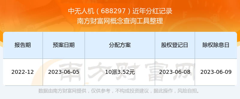 中無人機(jī)最新一次公布的分紅方案為10派3.52元。本次權(quán)益分派股權(quán)登記日為2023年6月8日,除權(quán)除息日為2023年6月9日,派息日為2023年6月9日。