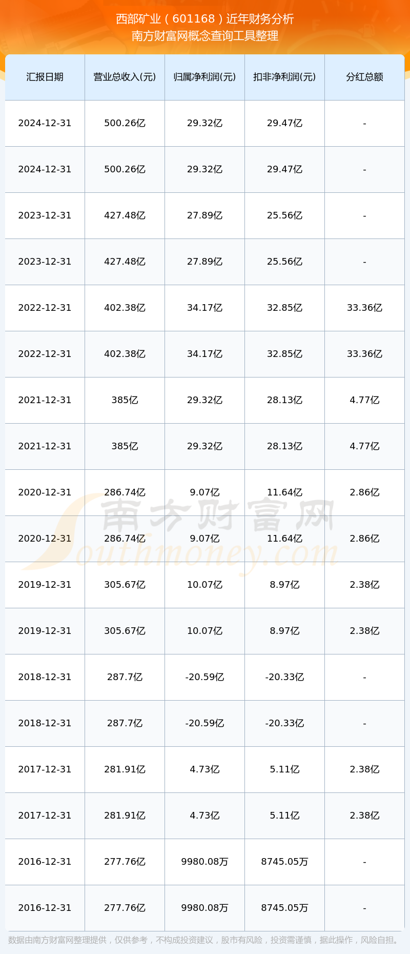 2024年報(bào)顯示,西部礦業(yè)實(shí)現(xiàn)營(yíng)收500.26億,同比增長(zhǎng)17.02%;凈利潤(rùn)29.32億,同比增長(zhǎng)5.1%;毛利率19.9%。