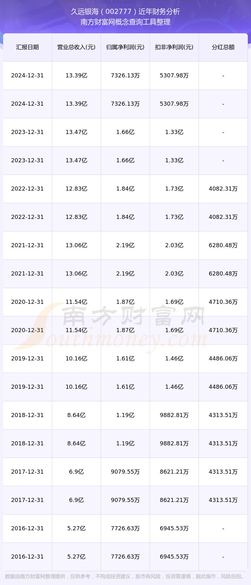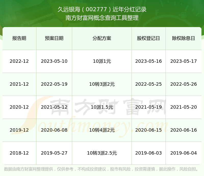 久遠(yuǎn)銀海歷年分紅派息情況如下表所示: