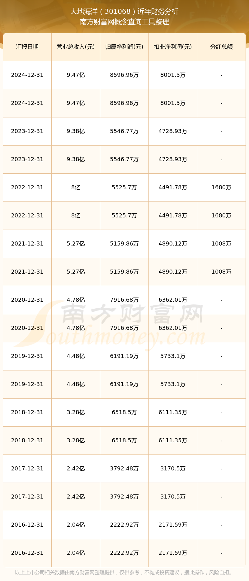 大地海洋公司2024年實(shí)現(xiàn)營(yíng)業(yè)收入9.47億元,同比增長(zhǎng)0.99%;凈利潤(rùn)8596.96萬(wàn)元,同比增長(zhǎng)54.99%;毛利率16.45%。