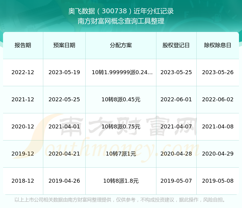 近年奧飛數(shù)據(jù)分紅派息情況如下表所示: