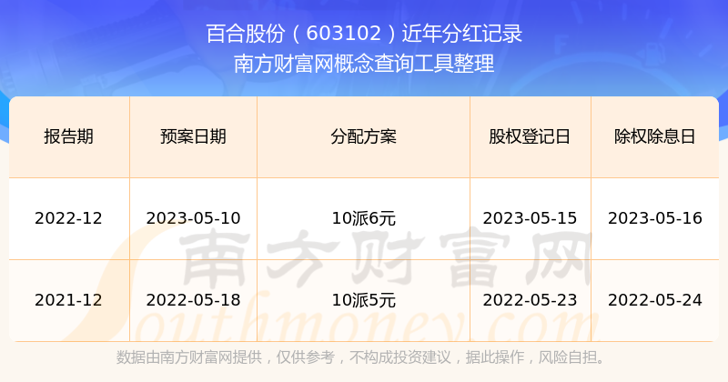 百合股份最新一次公布的分紅方案:10派6元。