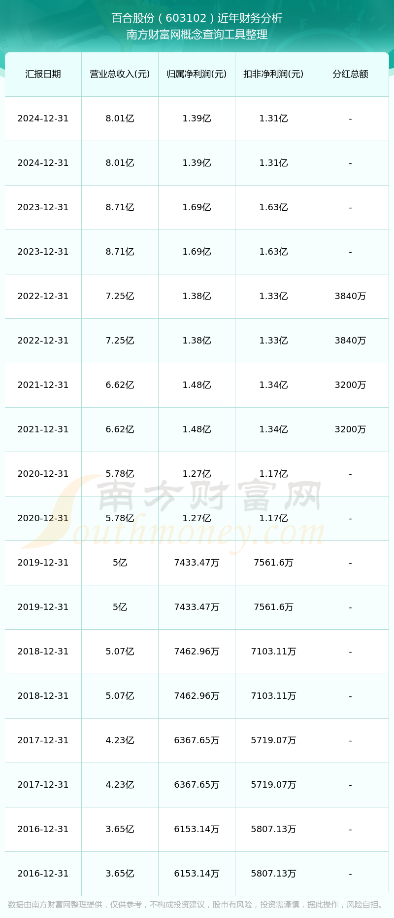 百合股份歷年分紅派息情況如下表所示: