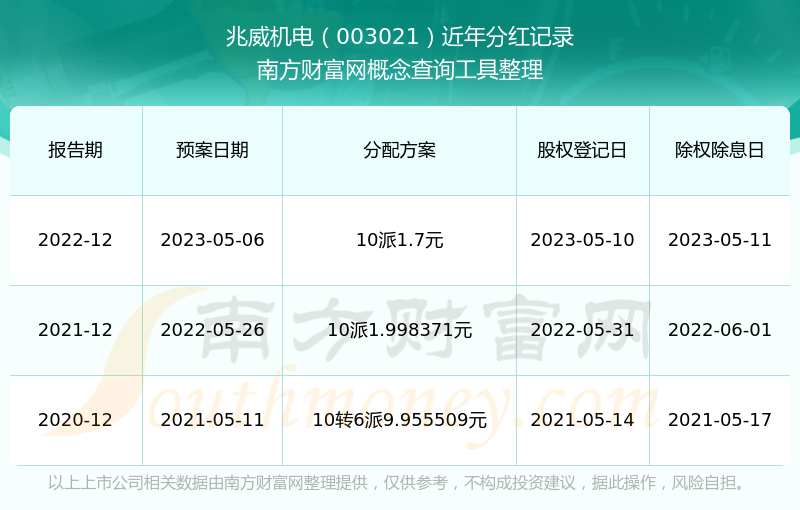 兆威機(jī)電最新一次公布的分紅方案為10派1.7元。本次權(quán)益分派股權(quán)登記日為2023年5月10日,除權(quán)除息日為2023年5月11日,派息日為2023年5月11日。