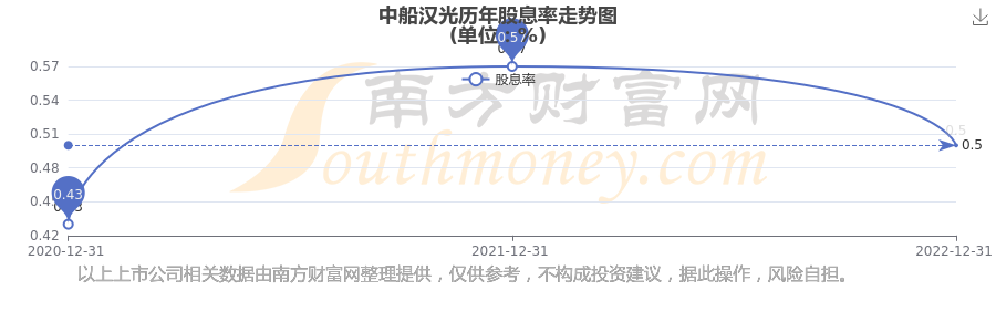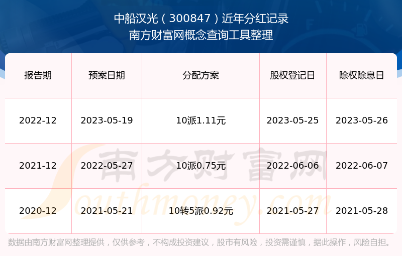中船漢光最新一次公布的分紅方案為10派1.11元。本次權(quán)益分派股權(quán)登記日為2023年5月25日,除權(quán)除息日為2023年5月26日,派息日為2023年5月26日。