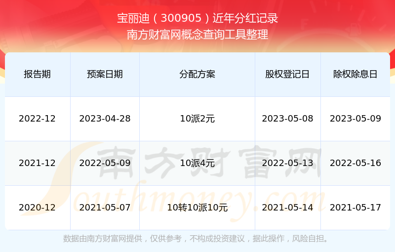 寶麗迪最新一次公布的分紅方案為10派2元。本次權益分派股權登記日為2023年5月8日,除權除息日為2023年5月9日,派息日為2023年5月9日。