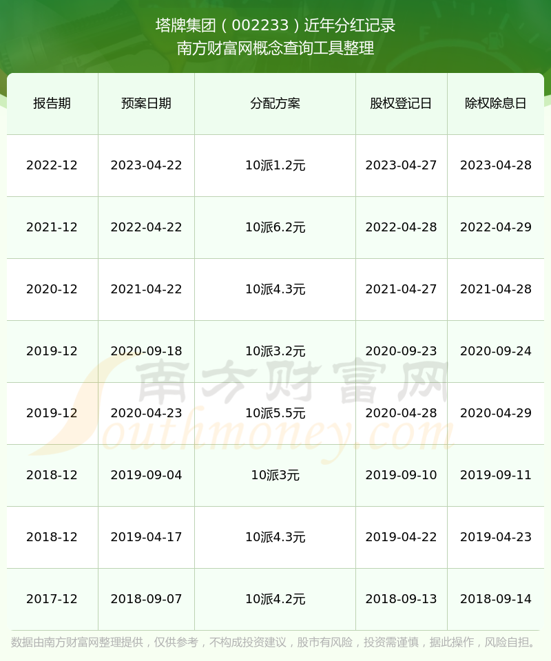 塔牌集團(tuán)最新一次公布的分紅方案為10派1.2元。本次權(quán)益分派股權(quán)登記日為2023年4月27日,除權(quán)除息日為2023年4月28日,派息日為2023年4月28日。