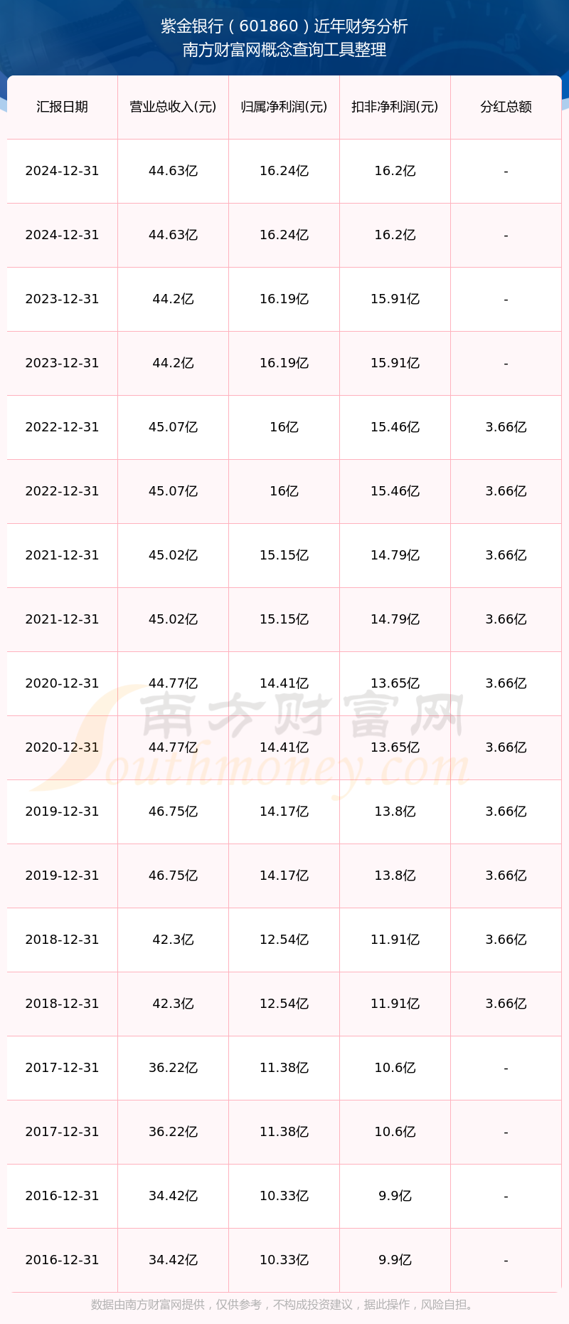 紫金銀行2024年總營收44.63億,同比增長0.98%;凈利潤16.24億。