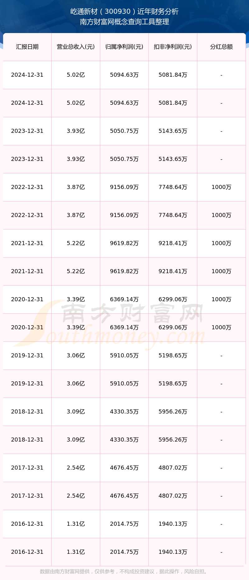 屹通新材歷年分紅派息情況如下表所示:
