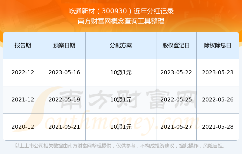 屹通新材最新一次公布的分紅方案為10派1元。本次權(quán)益分派股權(quán)登記日為2023年5月22日,除權(quán)除息日為2023年5月23日,派息日為2023年5月23日。