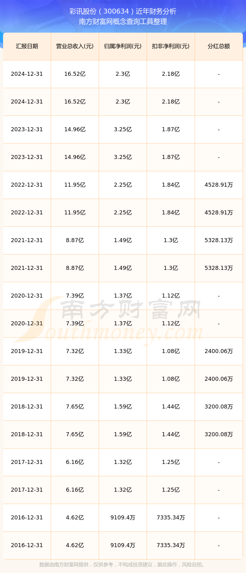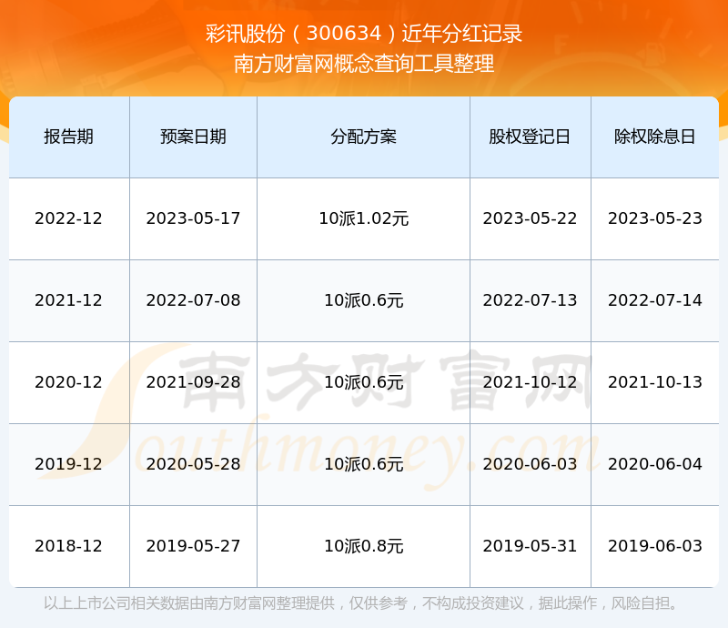 彩訊股份歷年分紅派息情況如下表所示: