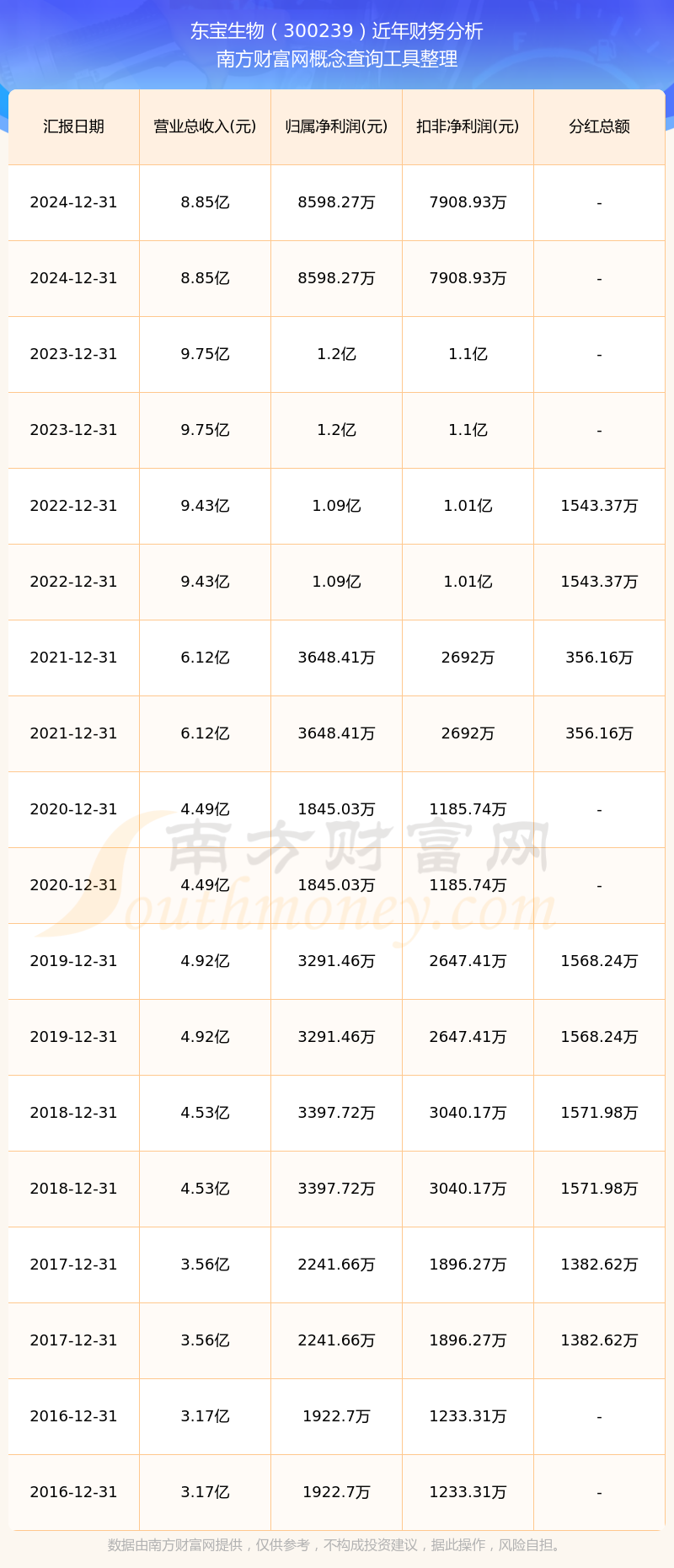 2024年?yáng)|寶生物總營(yíng)收8.85億,同比增長(zhǎng)-9.19%;凈利潤(rùn)8598.27萬(wàn),同比增長(zhǎng)-28.28%;銷售毛利率22.72%。